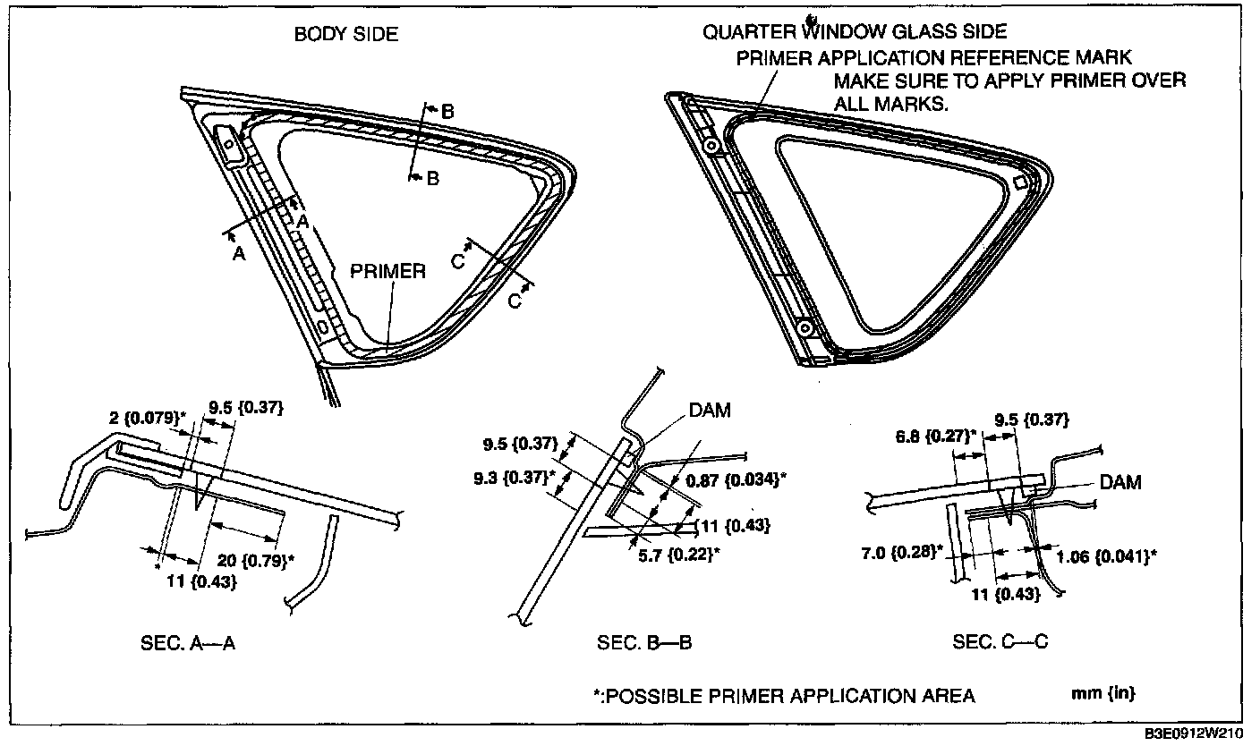 5. Use only glass primer on the quarter window glass, and body primer on the body, then allow it to dry for approx. 30 min.