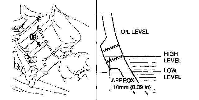 ^ If the oil level is lower than the low level, add the specified amount and type of oil through the oil level plug hole.