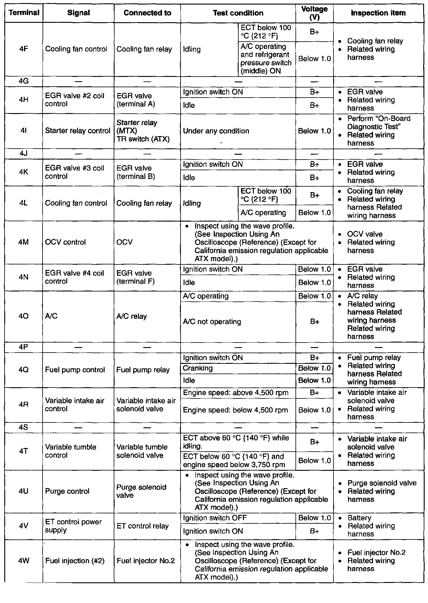 Terminal Voltage Table (Reference) - Terminals (4F - 4W):