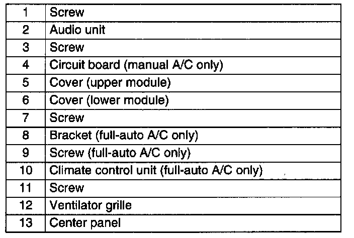 CENTER PANEL MODULE DISASSEMBLY/ASSEMBLYCAUTION: Before disassembling the center panel module, spread a cloth on the floor to put the disassembled parts on. This protects the surface of the panel from scratches or dirt.