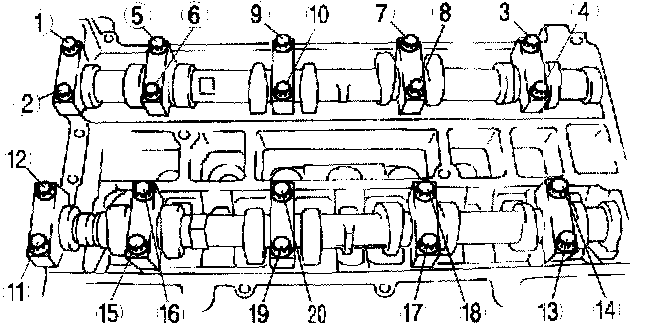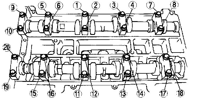 Tighten the camshaft cap bolts in the order shown with the following two steps.