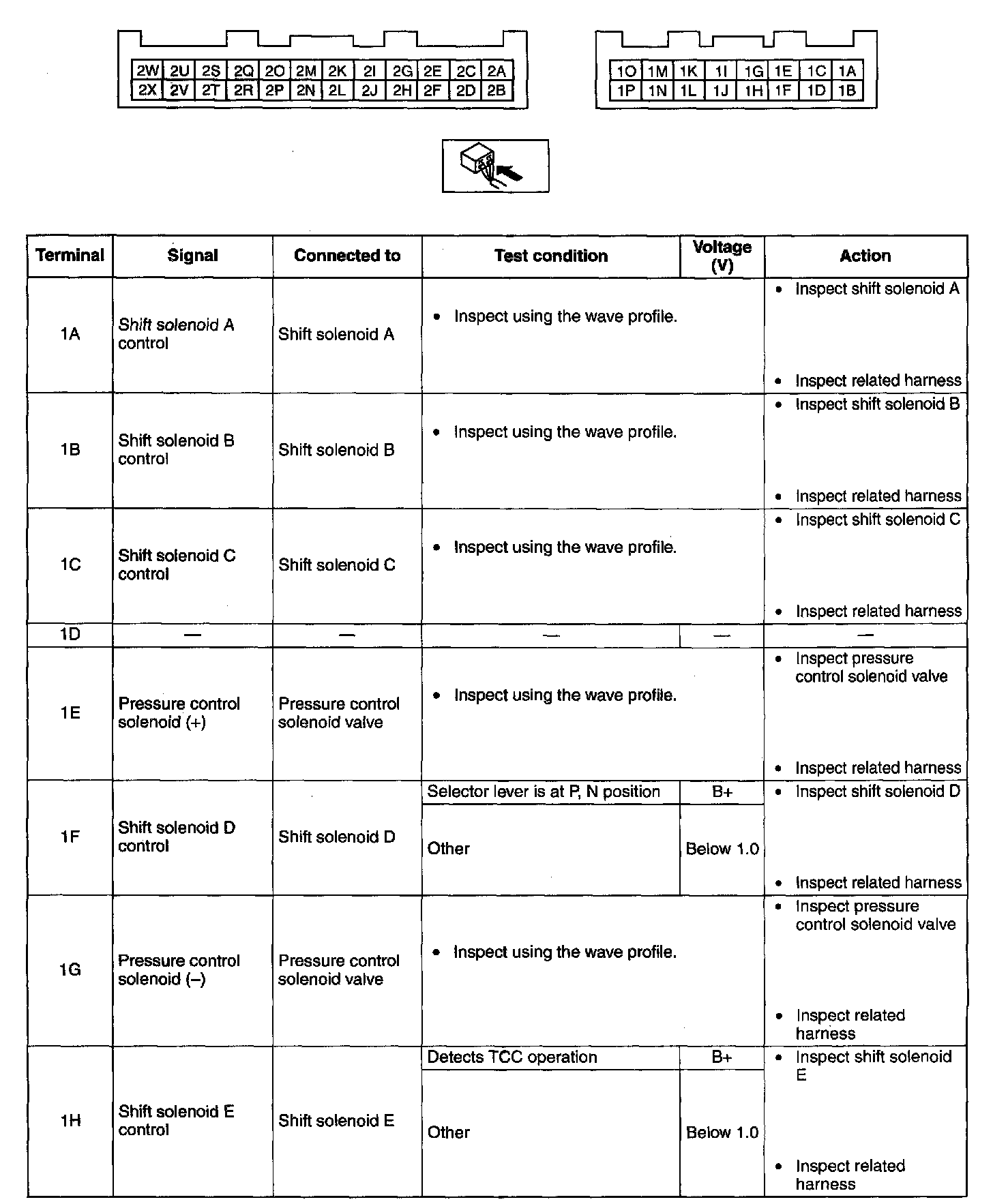 ^ Use the ground of terminal 10 and 1P of the TCM when measuring terminal voltage, as an error may occur when connecting the negative circuit tester to ground.