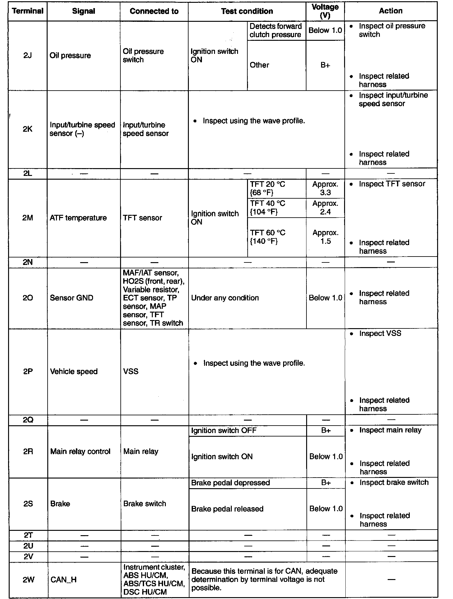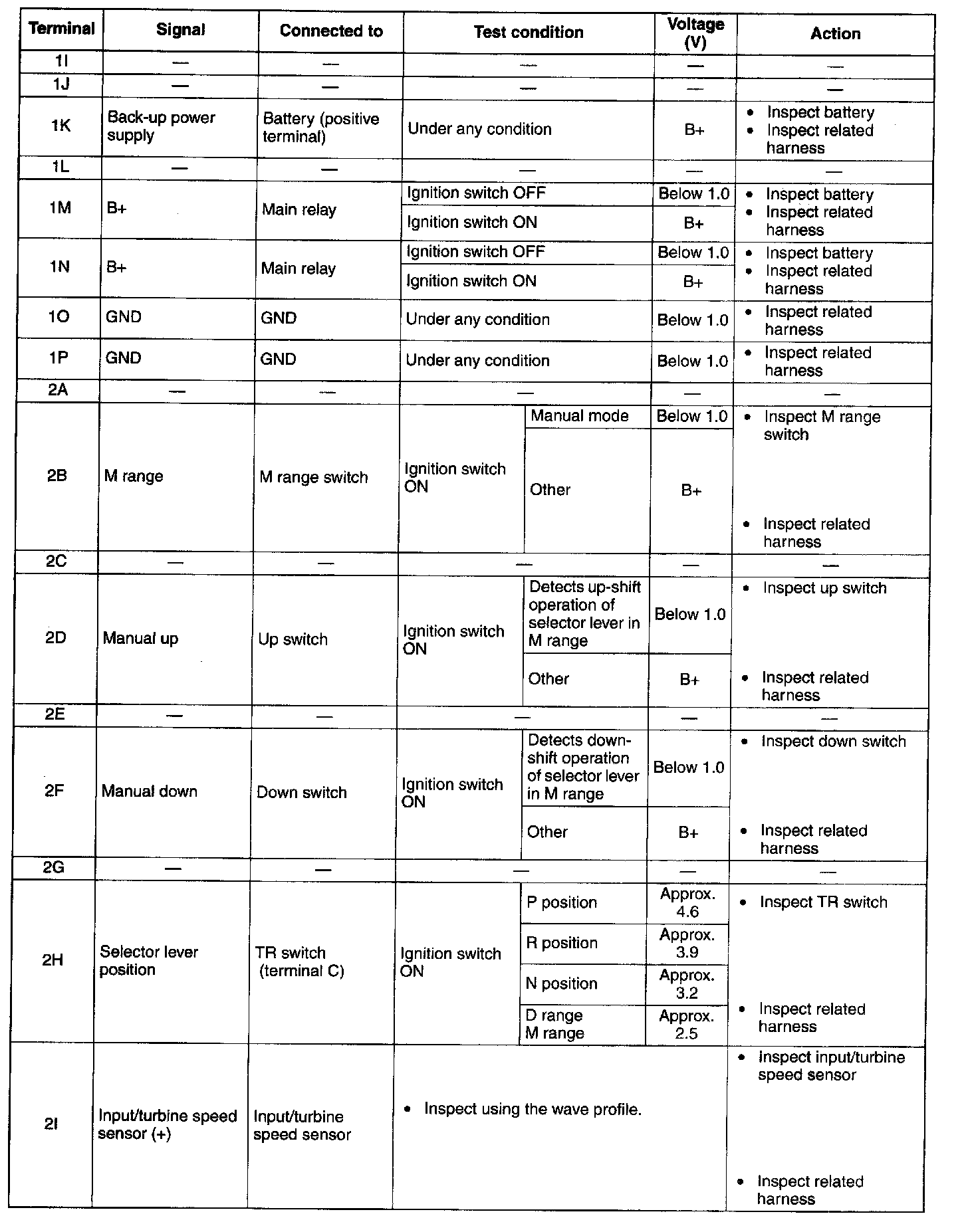 ^ The TCM terminal voltages vary with changes in measuring and vehicle conditions. Always carry out a total inspection of the input and output systems, and the TCM to determine the cause of trouble. Otherwise, a mis-diagnosis could occur.