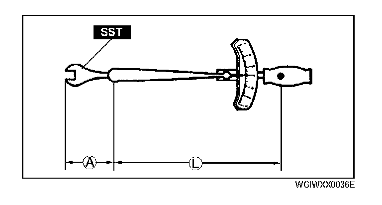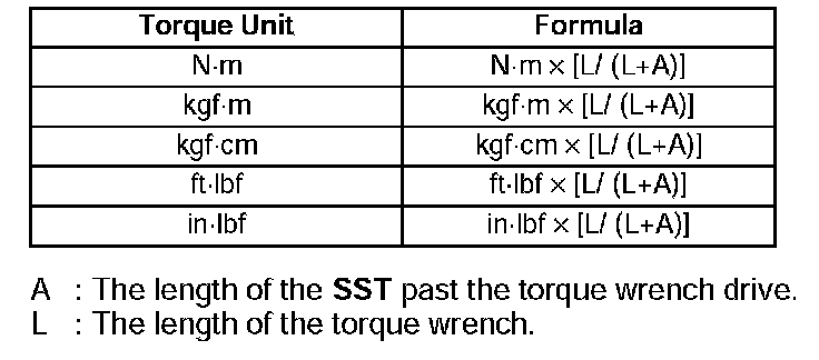 ^ When using a torque wrench-SST or equivalent combination, the written torque must be recalculated due to the extra length that the SST or equivalent adds to the torque wrench. Recalculate the torque by using the following formulas. Choose the formula that applies to you.