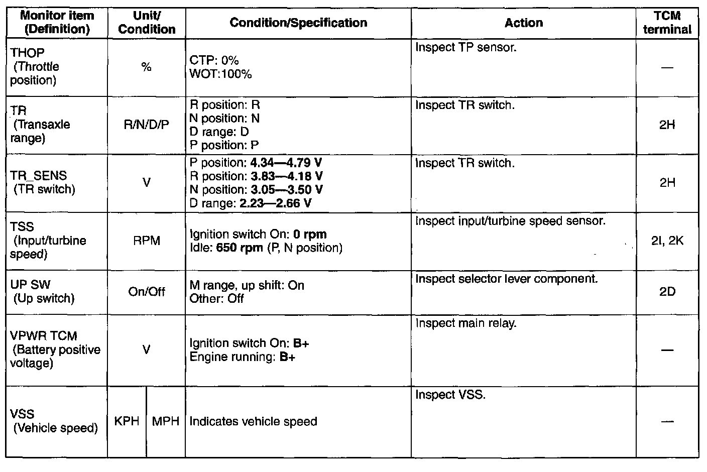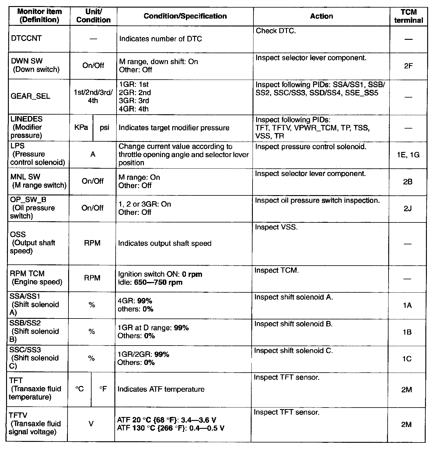 ^ The PID/DATA MONITOR function monitors the calculated value of the input/output signals in the TCM. Therefore, if a monitored value of an output device is out of specification, it is necessary to inspect the monitored value of the input device related to the output device control. Since an output device malfunction is not directly indicated as a malfunction of the monitored value for the output device, it is necessary to inspect the output device individually using the simulation function.
