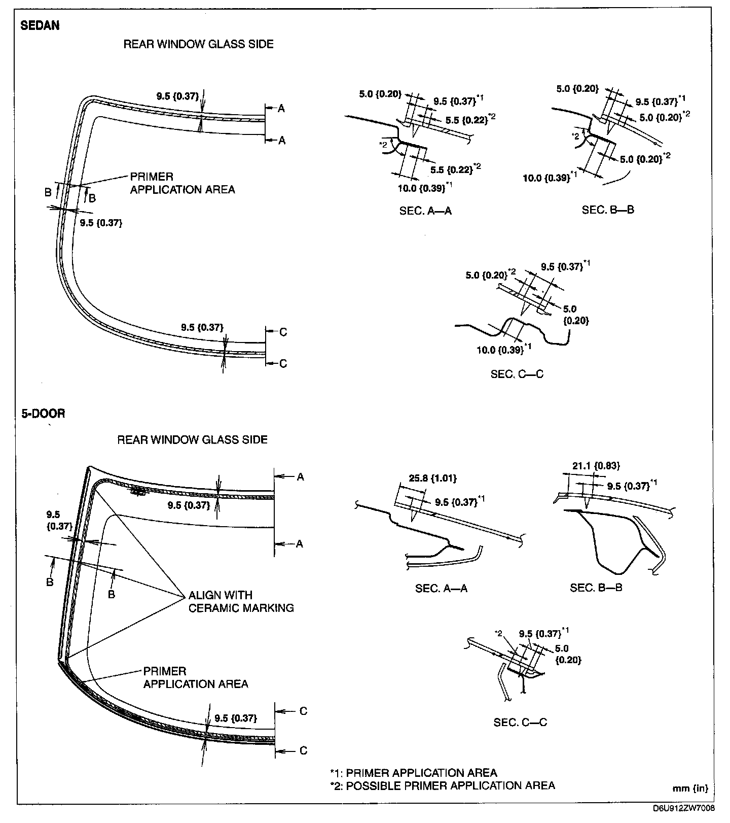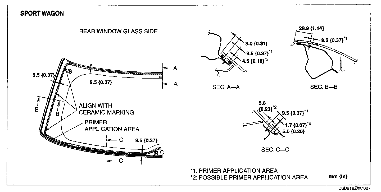 CAUTION: Keep the area free of dirt and grease, and do not touch the surface or the primer may not properly bond to the surface of the glass and body, which may cause leaks to occur.