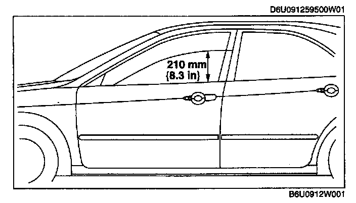 1. Operate the front door glass so that the distance from the top of the front door glass to the upper part of the front beltline molding is 210 mm {8.3 in}.
