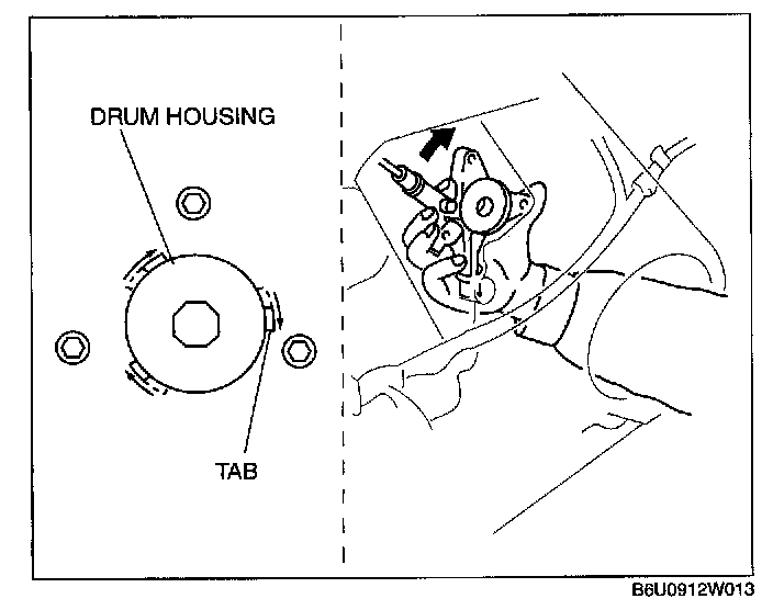 6. Insert hand through the speaker installation hole, rotate the regulator drum housing in the direction shown in the figure, and disengage the regulator drum housing from the door unit connection tabs.