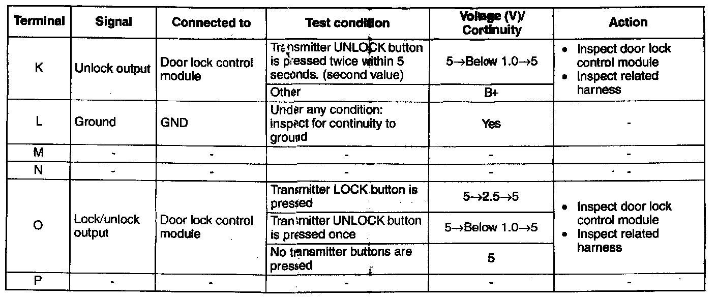 2. Measure the voltage at the keyless control module terminals (other than terminal L) as indicated.