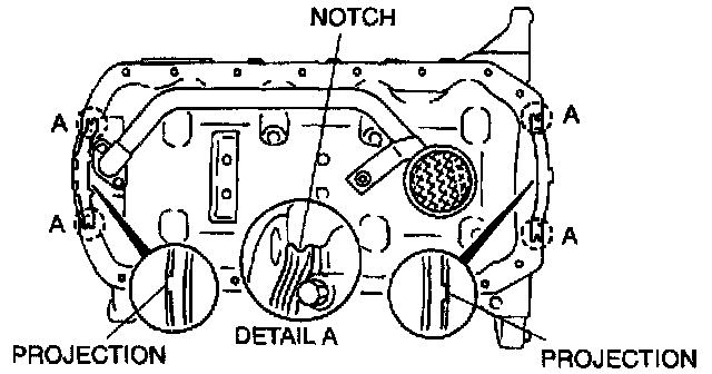 2. Install oil pan gaskets onto the oil pump body and the rear cover with the projections in the notches as shown.