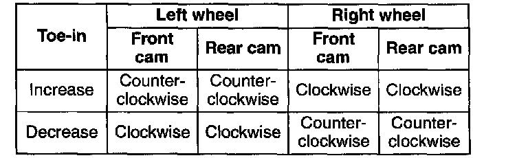 ^ If the cam cannot be turned far enough to make the adjustment, begin adjustment of the toe-in again using the other cam.