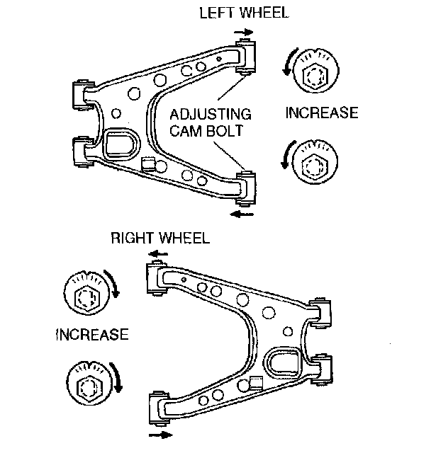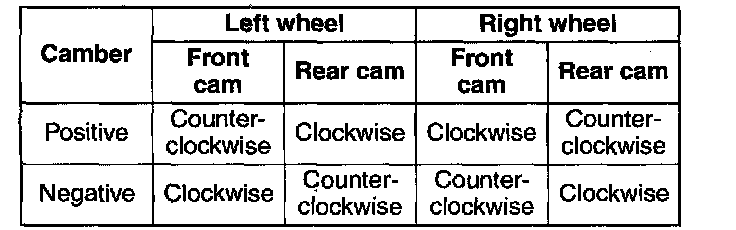 2. Turn the front and rear adjusting cam bolts the same amount in the opposite direction equally to provide the correct camber angle.