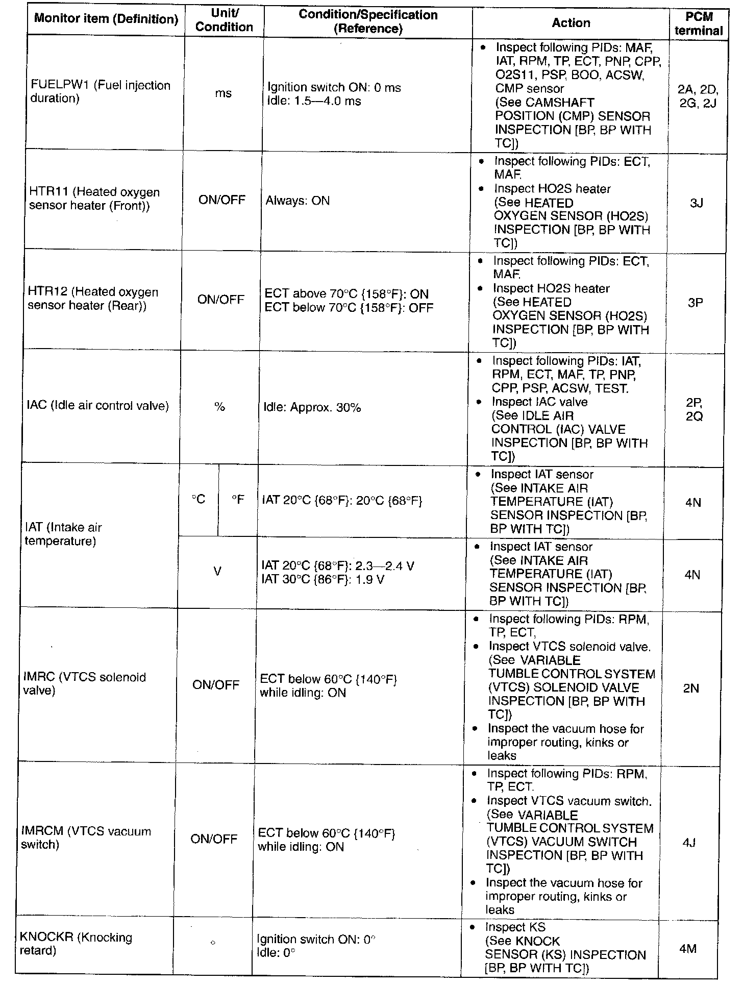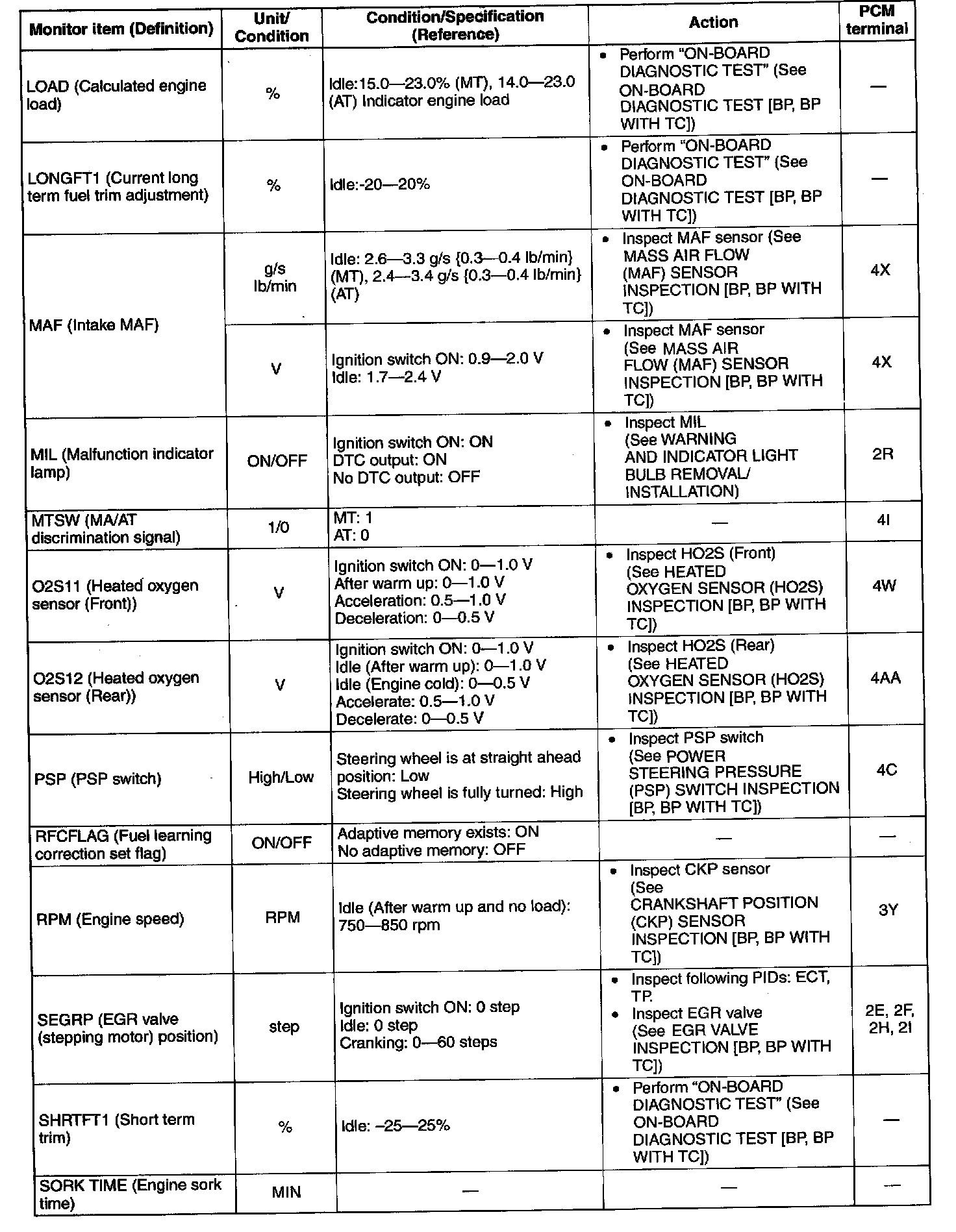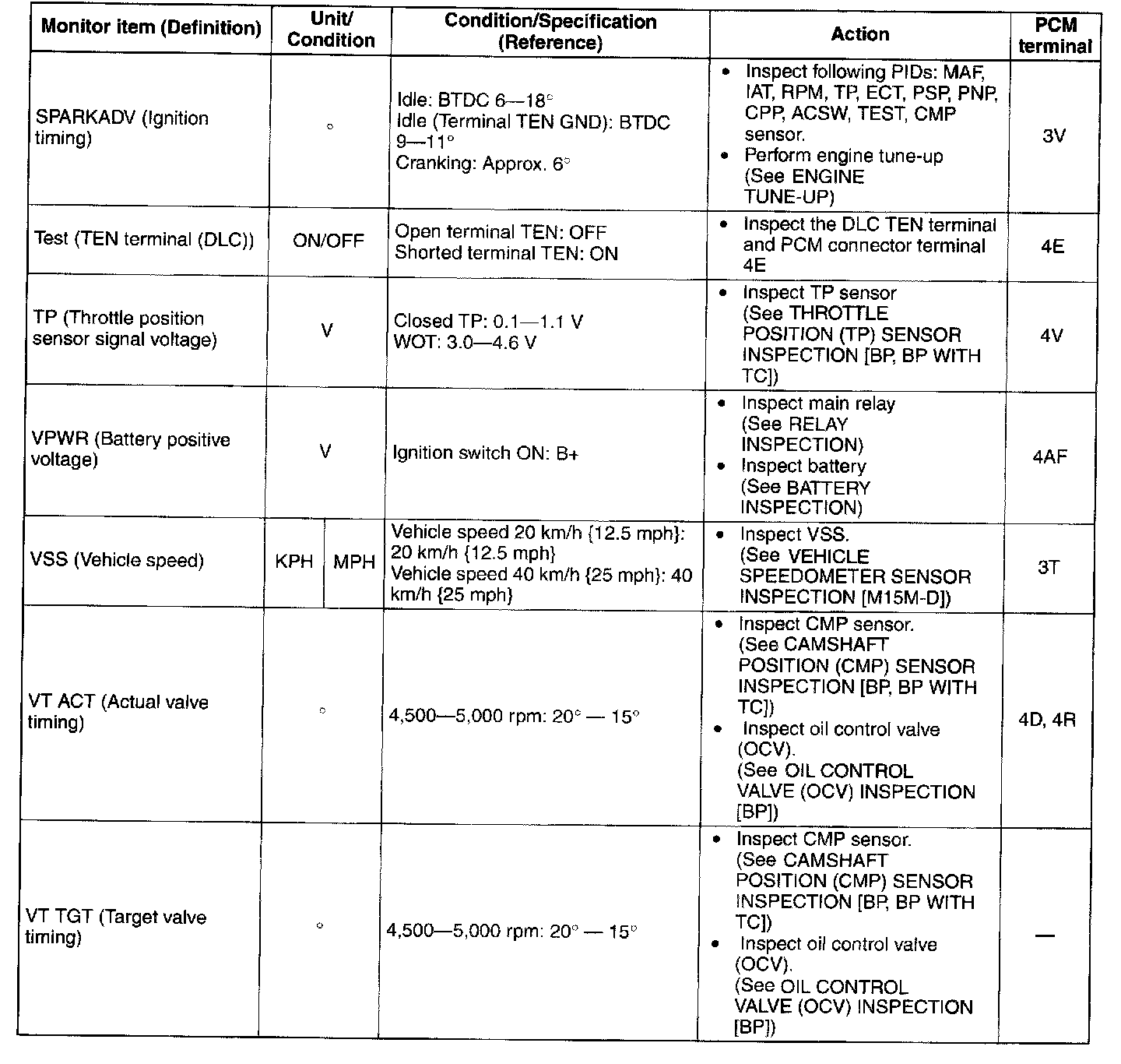 - Camshaft position sensor. (See CAMSHAFT POSITION (CMP) SENSOR INSPECTION [BP, BP WITH TC].)