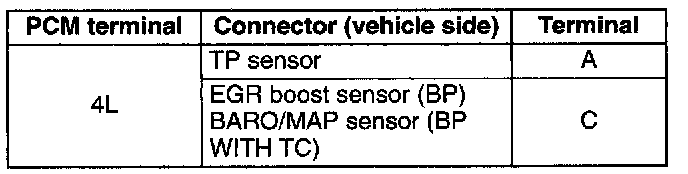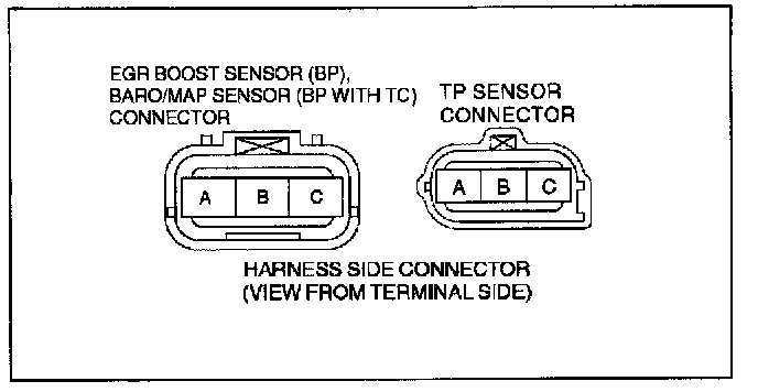 2. Disconnect the TP sensor connector, EGR boost sensor (BP), and BARO/MAP sensor (BP WITH TC) connector (to which Vref is applied).