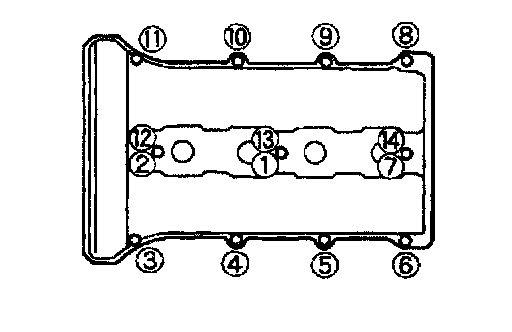Tighten the cylinder head cover bolts in two or three step in the order shown.