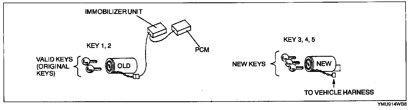 - To make a copy of the key or replace the immobilizer system component parts (the key(s), steering lock, immobilizer unit and/or PCM), the customer should bring all keys to the dealer. This is because the previously programmed key IDs are erased when reprogramming the key IDs into the immobilizer unit and PCM.