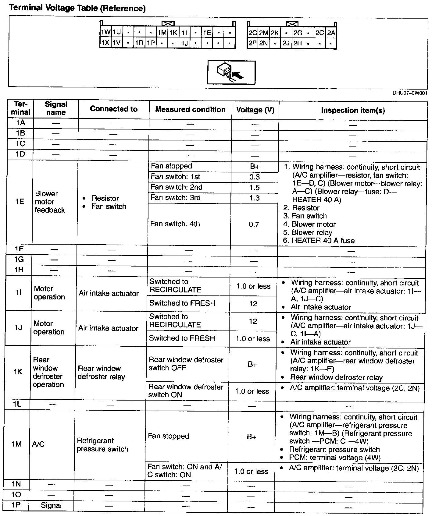 3. By inserting the positive (+) lead of the tester into each A/C amplifier terminal, measure the voltage according to the terminal voltage table.