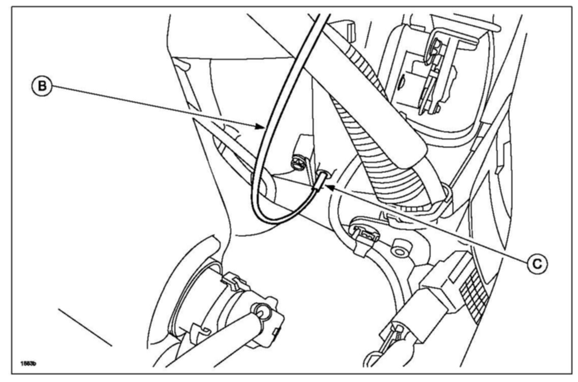 6. Insert engine cleaner spray hose (B) into front port nipple (C).