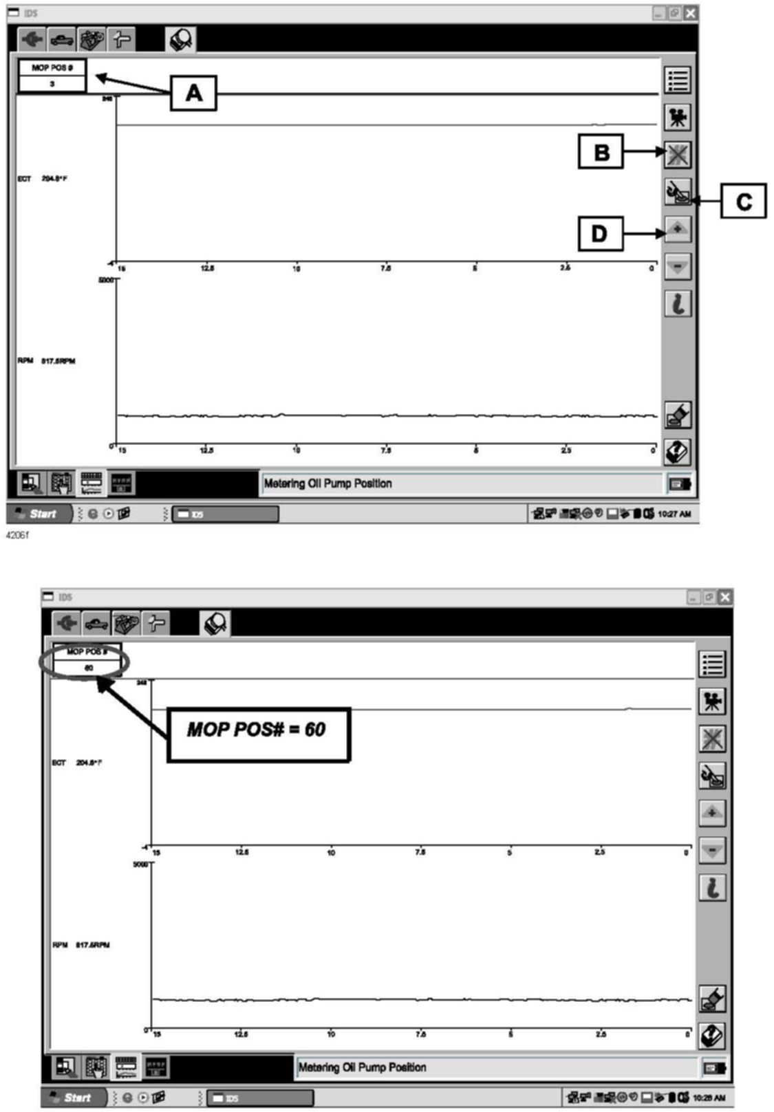 22. Allow engine to idle for 15 minutes with MOP POS # at step 60.
