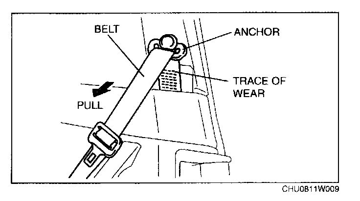1. If the vehicle has been subjected to a shock in an accident, pull the belt from the retractor and confirm that there are no wear tracks (the load limiter has not operated) by visually inspecting and feeling the belt.
