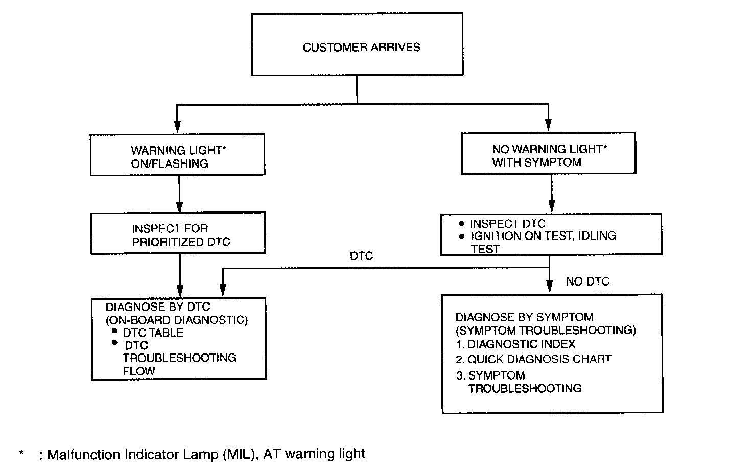 FOREWORD^ When the customer reports a vehicle malfunction, check the malfunction indicator lamp (MIL), AT warning light illuminating, and TCM memory for diagnostic trouble code (DTC), then diagnose the malfunction according to the following flowchart.