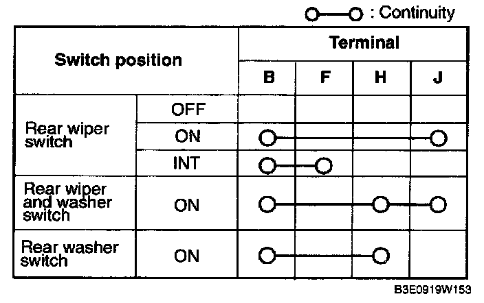 REAR WIPER AND WASHER SWITCH INSPECTION1. Verify that the continuity between the rear wiper and washer switch terminals is as indicated in the table.