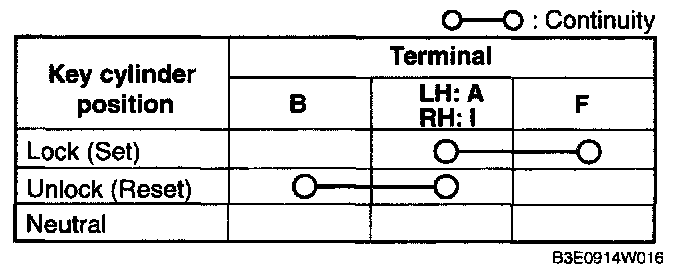 Inspect for continuity between the front door key cylinder switch terminals.