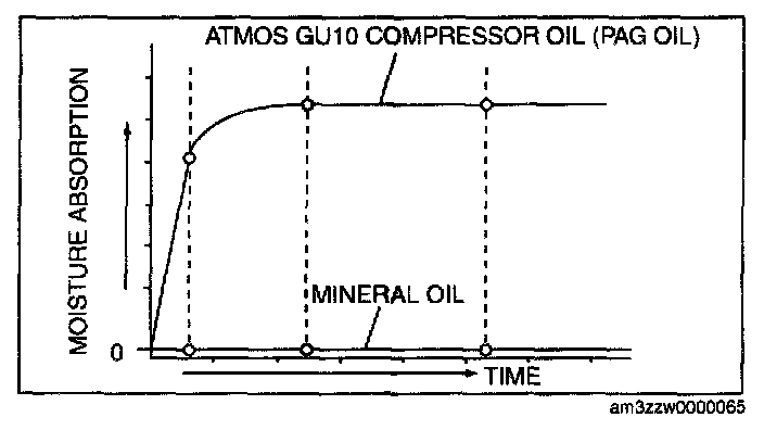 - ATMOS GU10 compressor oil (PAG oil) has a higher moisture absorption efficiency than the previously used mineral oil. If moisture mixes with the compressor oil, the refrigerant system could be damaged. Therefore, install caps immediately after using the compressor oil or removing refrigerant system parts to prevent moisture absorption.