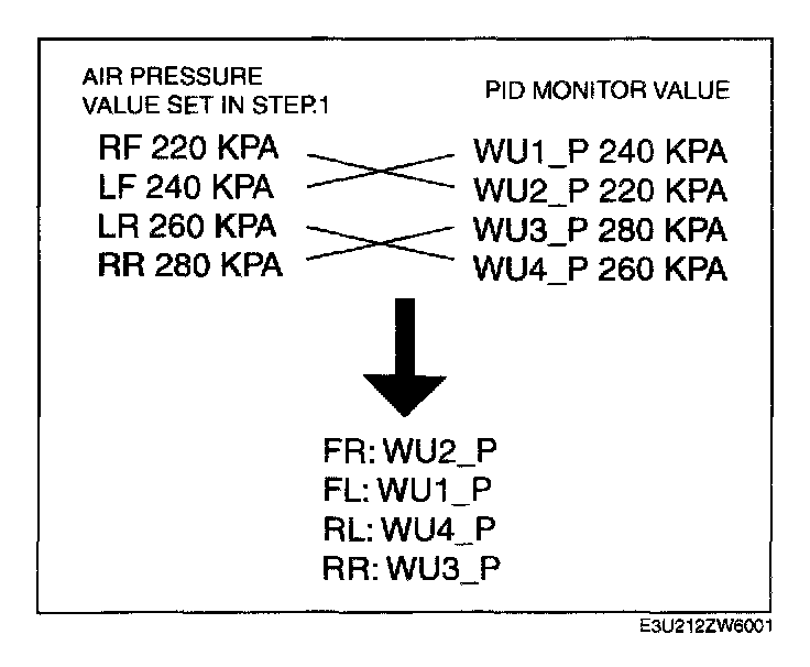 7. Determine which wheel unit identification code matches which wheel and tire by comparing the PID monitor values with the air pressure values set in Step 1.