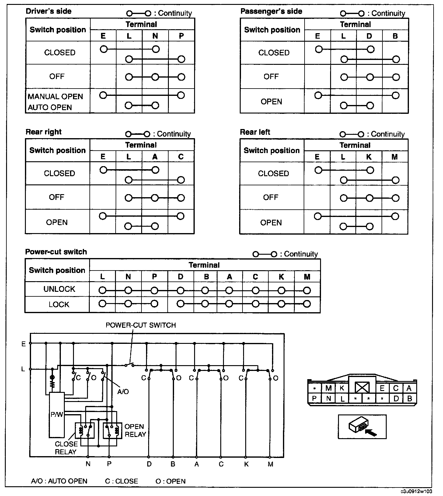 POWER WINDOW MAIN SWITCH INSPECTION1. When inspecting the passenger-side and rear power windows, turn the power-cut switch to UNLOCK.