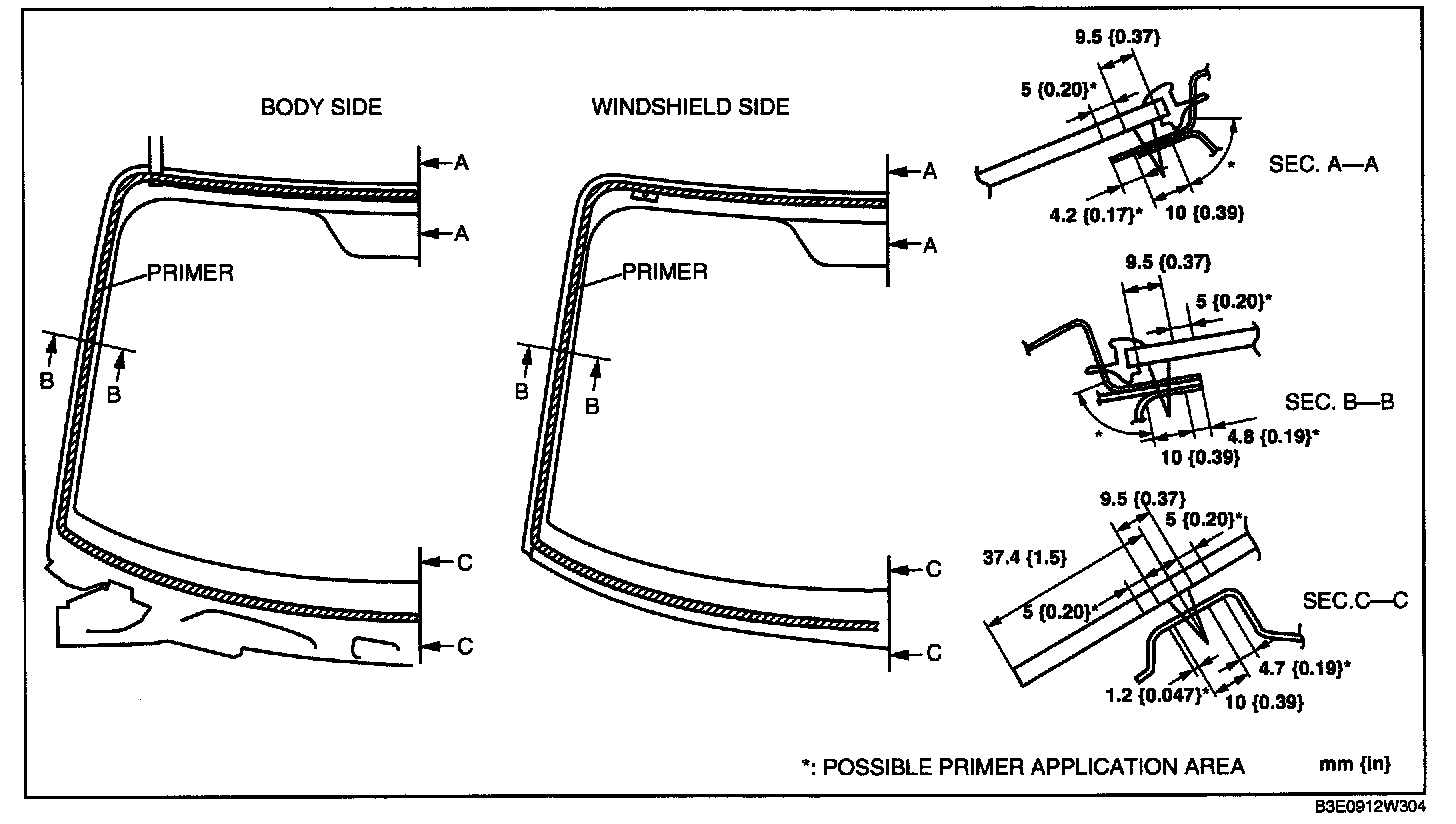 CAUTION: Keep the area free of dirt and grease, and do not touch the surface. Otherwise, the primer may not properly bond to the surface of the glass and body, which may cause leakage.