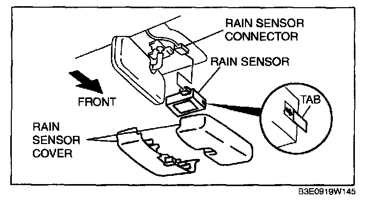 CAUTION: If the ignition switch is turned to the ON position after replacing a rain sensor with a new one, the rain sensor determines that there is no raindrops or dirt on the windshield and performs the initial setting. When replacing a rain sensor with a new one, thoroughly wipe off raindrops and dirt from the windshield.