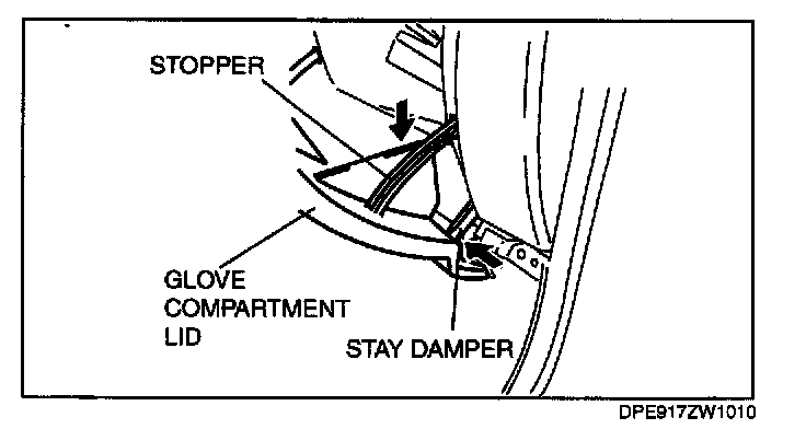 4. Press the stay damper in the direction shown by the arrow and detach it from the glove compartment lid.
