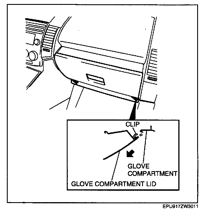 6. Pull the glove compartment lid outward while lowering it to the position shown in the figure, and then detach the clip and remove the glove compartment lid.