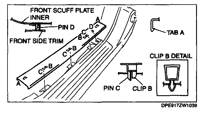 1. Pull the front scuff plate inner upward while detaching tabs A, detach clips B, pins C and D from the body, and then remove the front scuff plate inner.
