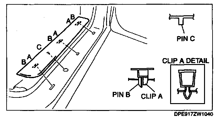 1. Pull the front scuff plate outer upward, detach clips A, pins B and C from the body, and then remove the front scuff plate outer.