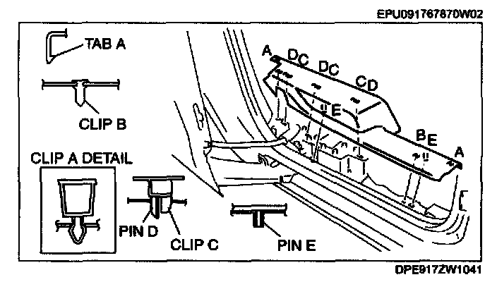 REAR SCUFF PLATE REMOVAL/INSTALLATION1. Pull the rear scuff plate upward while detaching tabs A, detach clips B and C, and pin D and E from the body, and then remove the rear scuff plate.