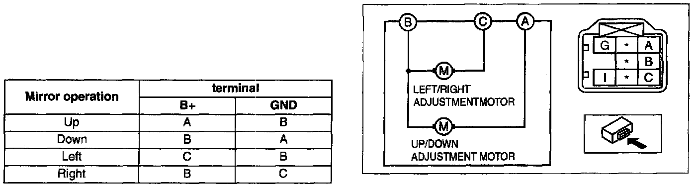 1. Apply battery positive voltage to the power outer mirror terminals and inspect the operation of the power outer mirror.