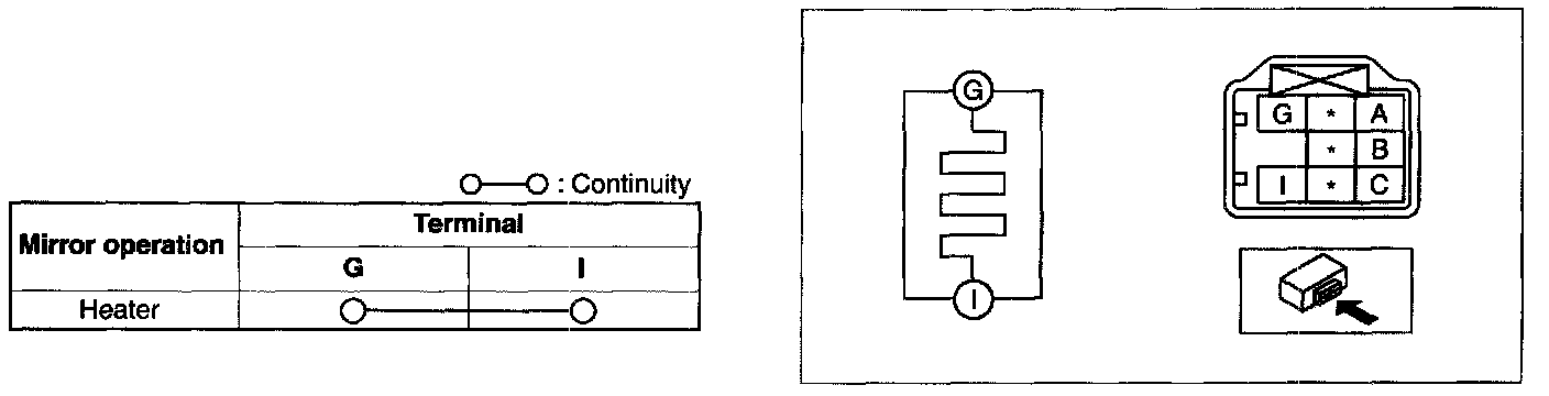 2. Inspect for continuity between the power outer mirror heater terminals.