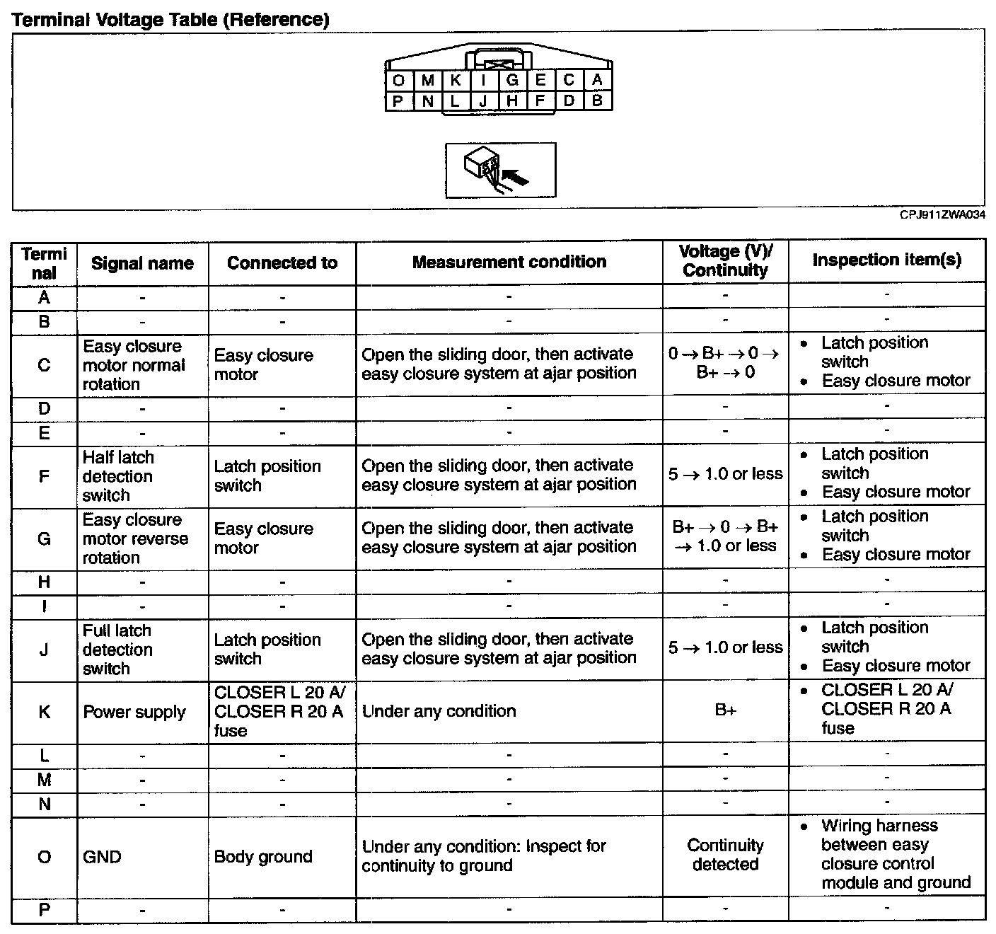 2. Before inspecting terminal O for continuity, disconnect the easy closure control module connector.