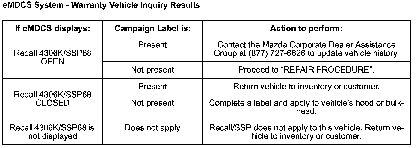 2. Perform a Warranty Vehicle Inquiry using your eMDCS System and inspect vehicle for a Campaign Label Recall 4306K/SSP 68 attached to the vehicle's hood or bulkhead. Refer to eMDCS System - Warranty Vehicle Inquiry Results table shown.