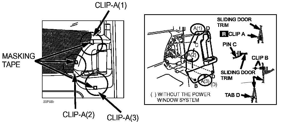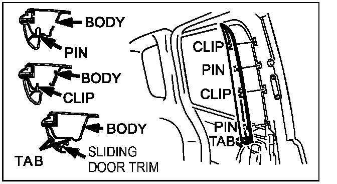 10. Pull the sliding door trim upward and detach tabs B from the sliding door and remove the sliding door trim.