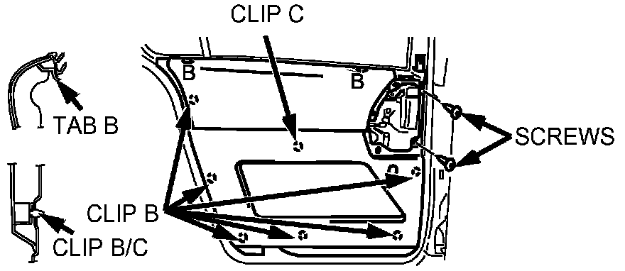 9. Detach clips B and C from the sliding door using a fastener remover tool.