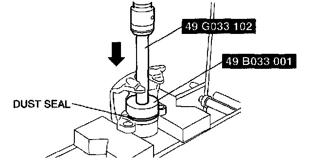 1. Assemble a new dust seal to the caliper using the SSTs and a press with a press-in force of 834 N (85 kgf, 187 inch lbs.).