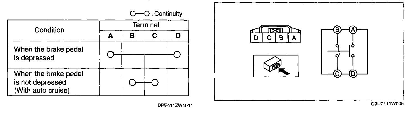 4. Verify that the continuity is as indicated in the table. If not as indicated in the table, replace the brake switch.