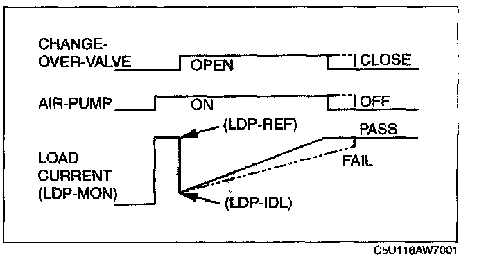 ii. After retrieving a reference current value, the PCM commands the change-over-valve to open, then captures the air pump load current value (LDP MON PID) as idle current (LDP IDL PID). The EVAP system will be pressurized from this phase.