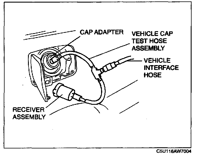 3. Connect the receiver assembly (SST: AKS441130) to the vehicle cap test hose assembly (part of the SST) and the fuel-filler cap from the vehicle.