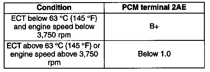 2. Verify that the PCM terminal 2AE voltage is as shown in the following table when the variable tumble shutter valve actuator rod is depressed and released by hand.