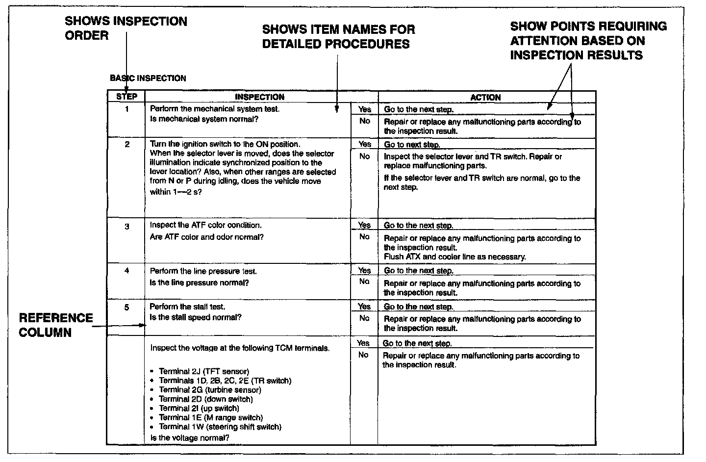 - Although inspections and adjustments are performed according to the reference column procedures, if the cause of the malfunction is discovered during basic inspection, continue the procedures as indicated in the action column.