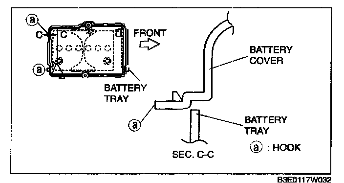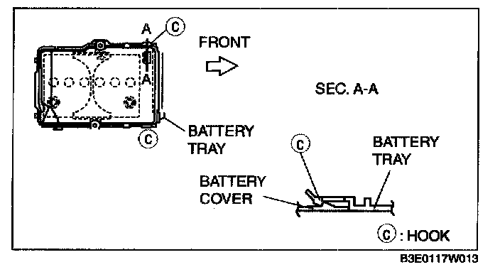 4. Set the battery cover to battery tray hooks C at two points.